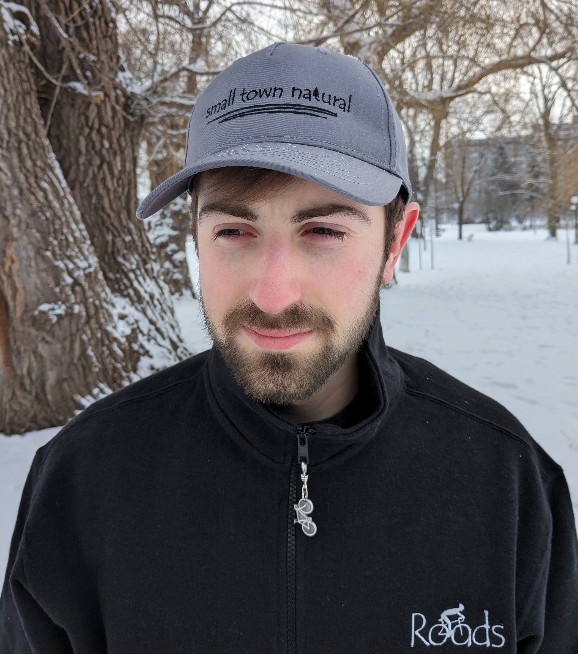 - Small Town Natural ('t' in natural is a tree embroidered graphic of same height as text) is embroidered in plain hand-printed text/font on front of hat in black thread (on black hat thread is light grey) with a thin zigzag line under text representing winding river / creek)